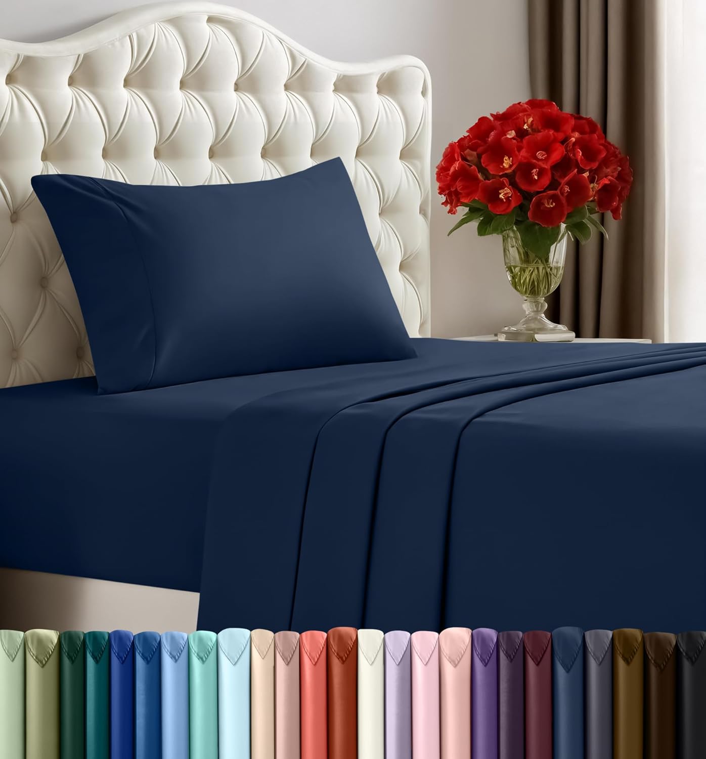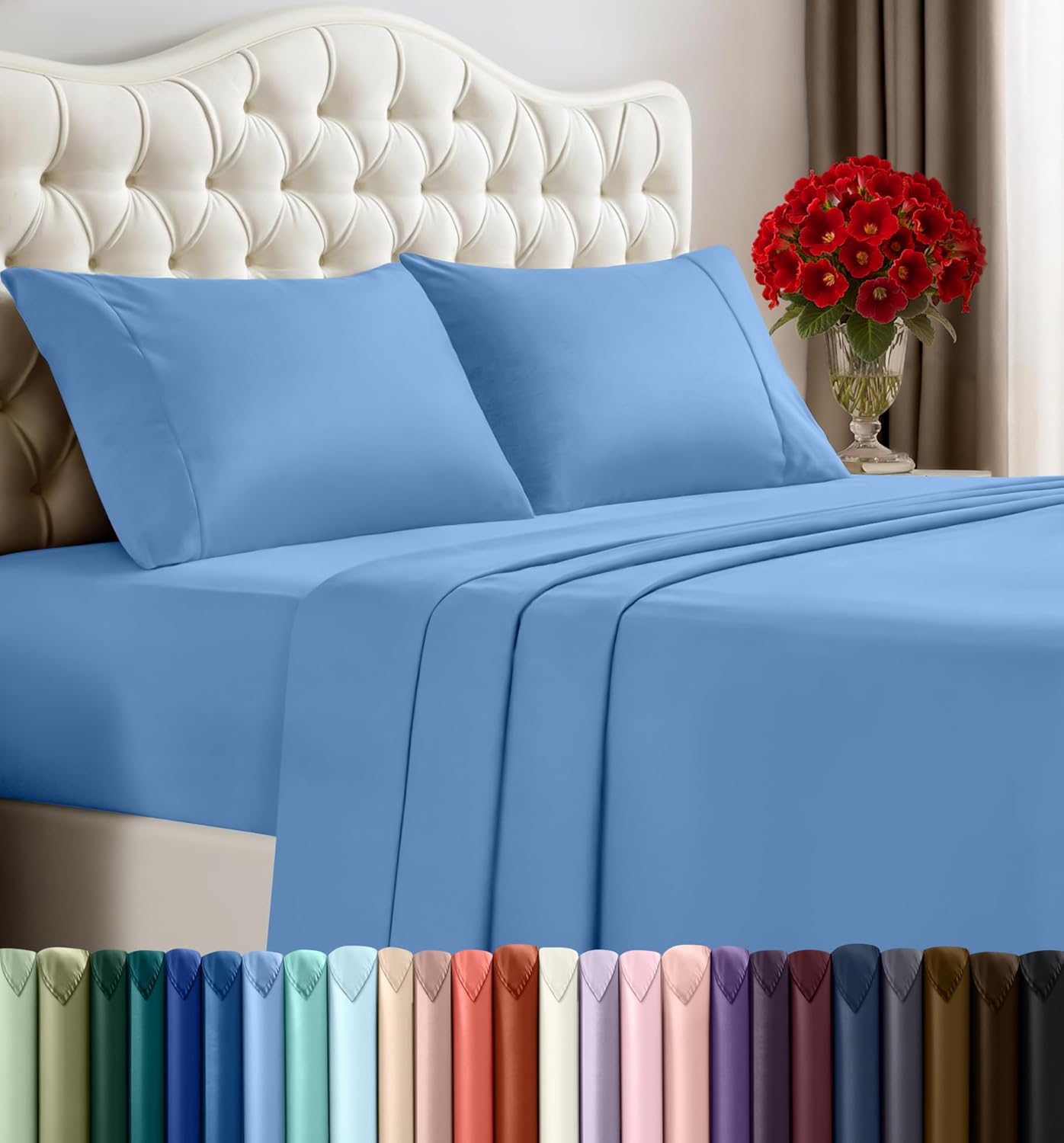 The bed sheet set is made of microfiber polyester fabric which is known for being relatively wrinkle free and fade resistant. To achieve a more enhanced look, iron on low heat.
